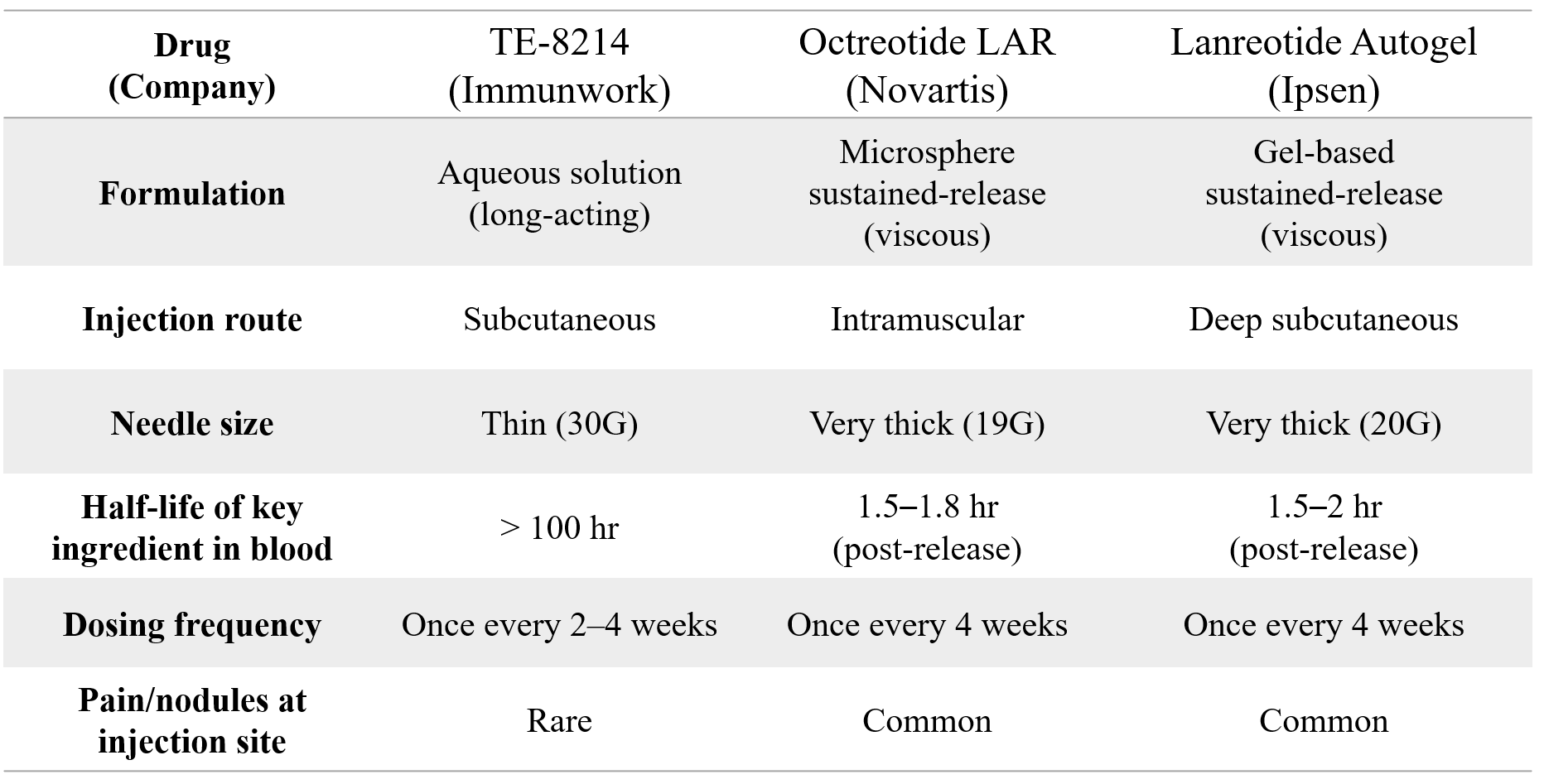 TE-8214 was developed using Immunwork’s proprietary fatty acid modification platform, which extends the drug's half-life and increases water solubility. TE-8214’s water-soluble, low-viscosity formulation allows for subcutaneous administration with a fine 30G needle, offering a dramatically improved patient experience compared to the current standard-of-care, which requires thick, viscous formulations administered with large 19G or 20G needles that often cause significant pain and injection site reactions. This innovation addresses a critical need for safer, more patient-friendly long-acting therapies in a global octreotide market projected to reach US$10 billion by 2030.